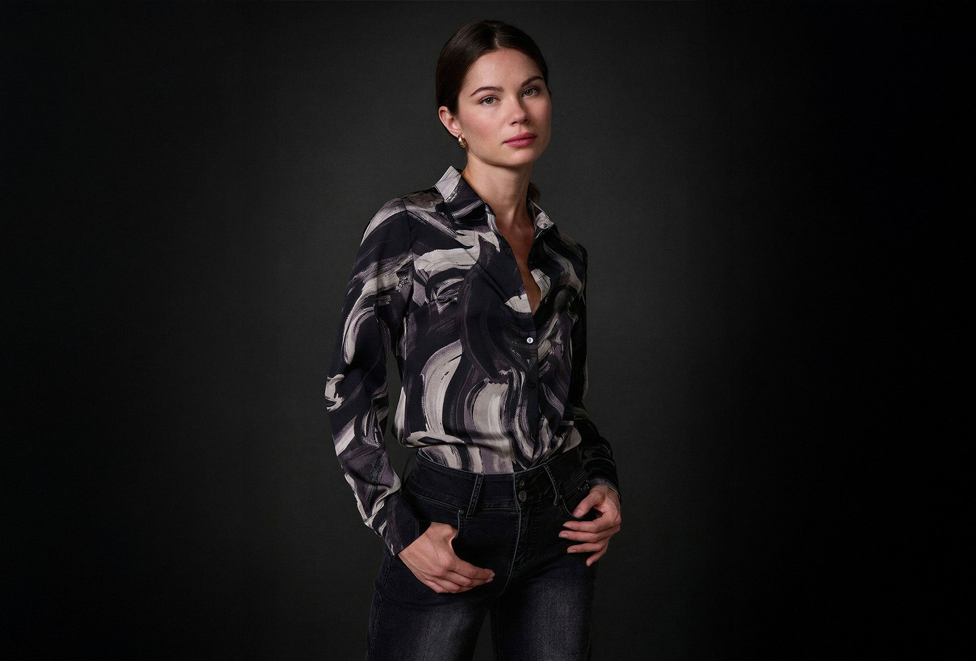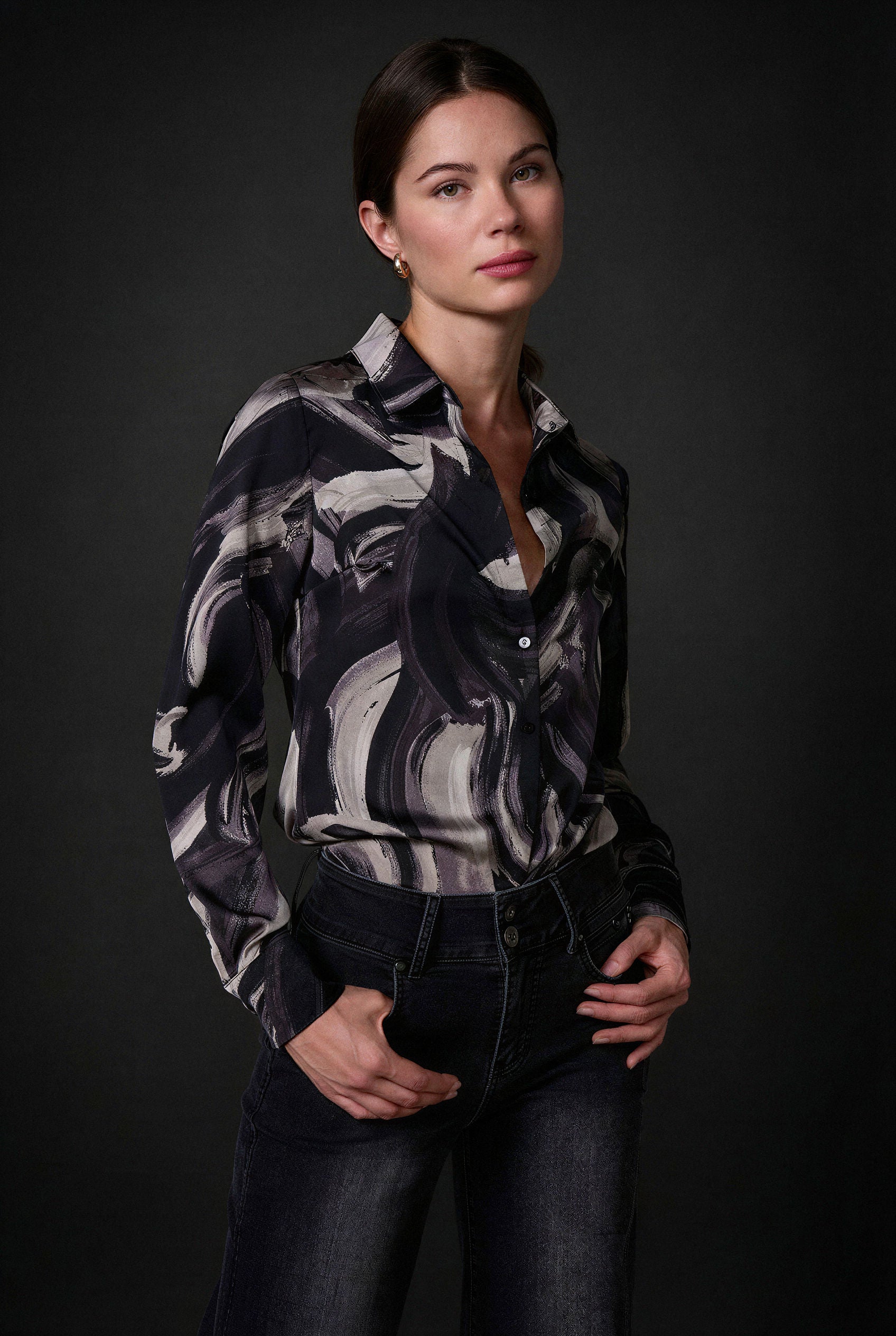 Mini shiny satin bambula women's long sleeve shirt, shirt collar, hidden button front closure.