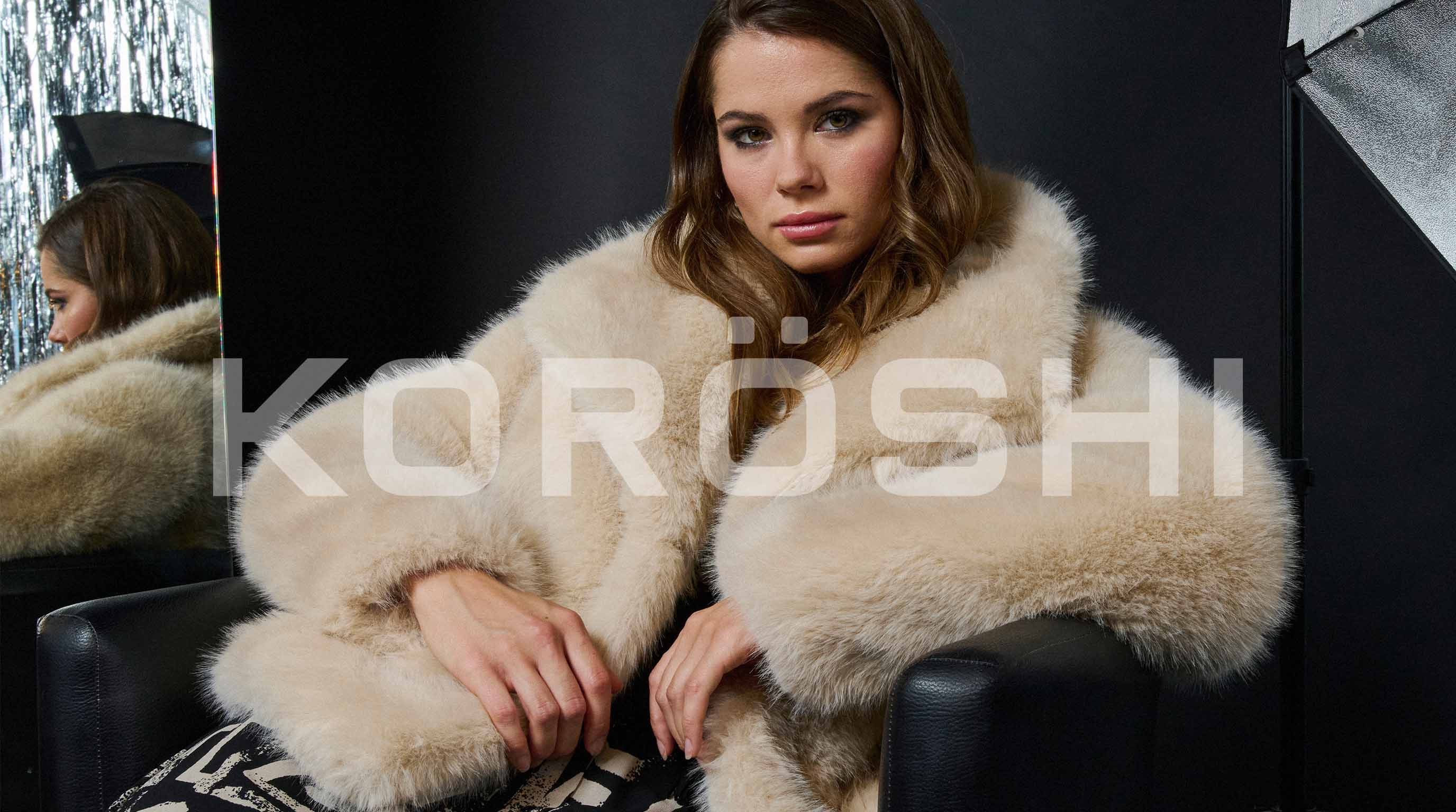 Robe courte pour femme en tissu élastique brillant, manches longues bouffantes, encolure croisée et logo Koröshi métallique. Doublure intérieure.