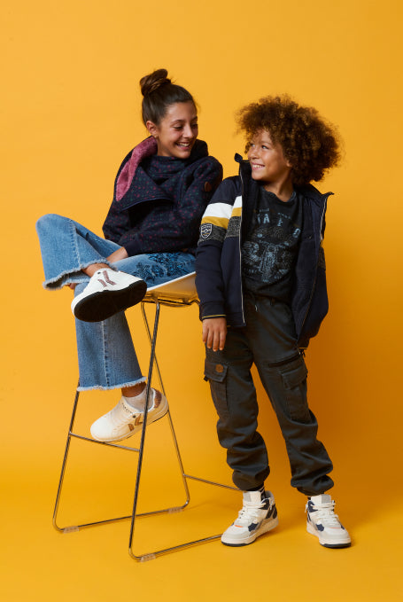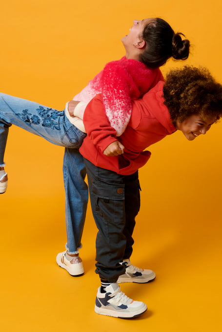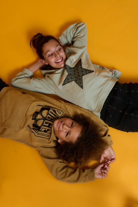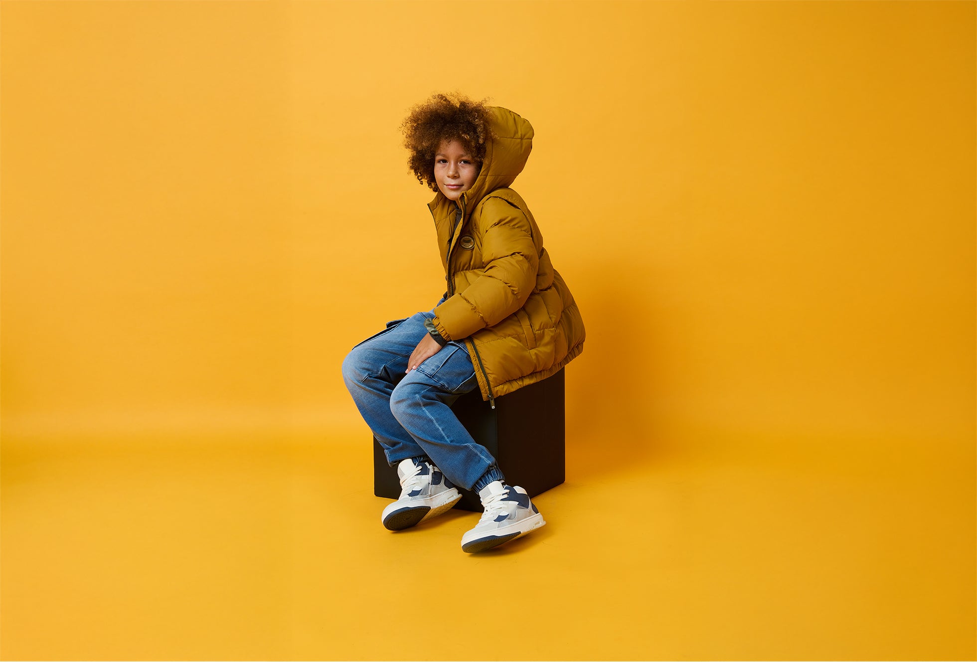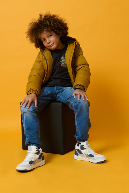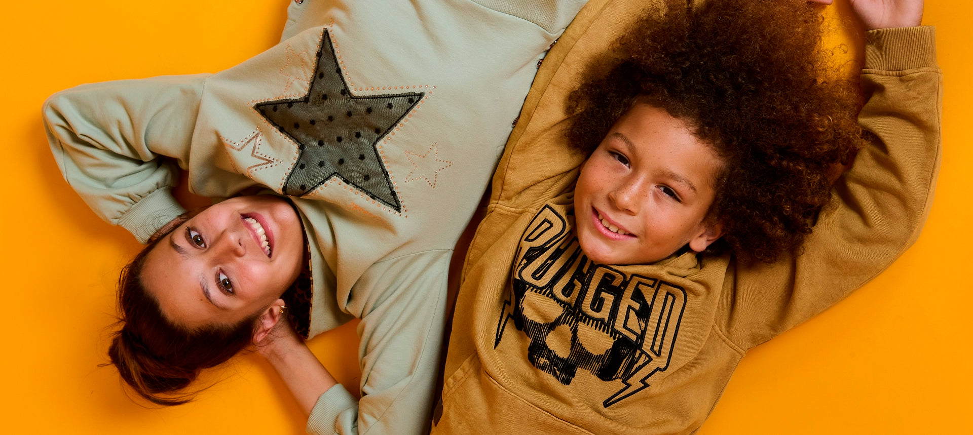 Sudadera de niño en algodón perchado mostaza efecto lavado, con capucha y bolsillo canguro. Cálida, cómoda y moderna.
